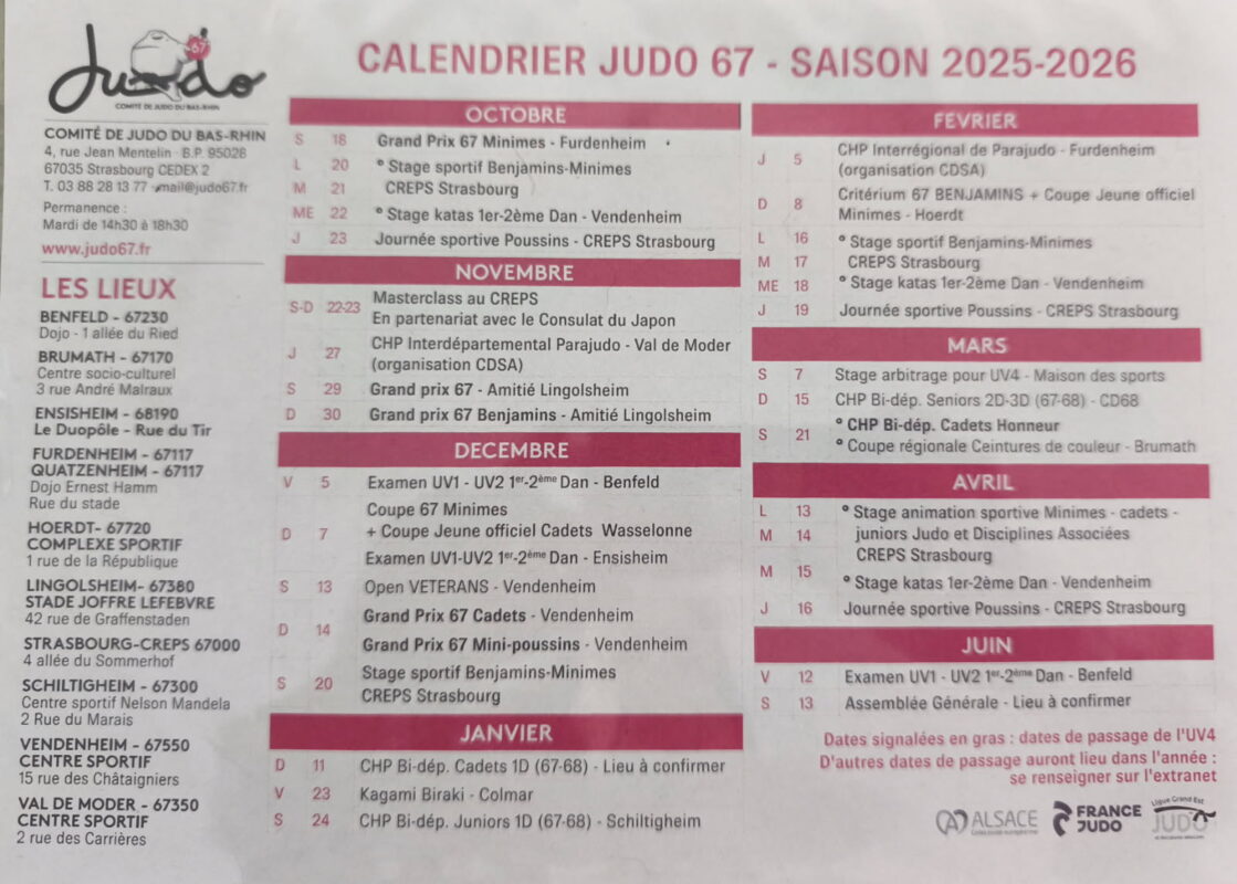 Nous vous attendons très nombreuses et nombreux dans la grande salle du bas ainsi qu’au dojo, pendant la Journée du sport et des loisirs en famille, organisée comme chaque année par la ville d’Illkirch-Graffenstaden au Gymnase Lixenbuhl d’Illkirch, et qui aura lieu cette année le dimanche 07 septembre 2025 de 10h à 17h.